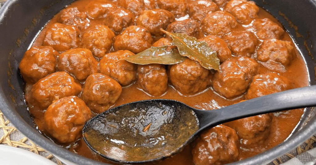 Colocar as almôndegas e um pouco de pimentos triturados novamente no tacho e as folhas de louro.