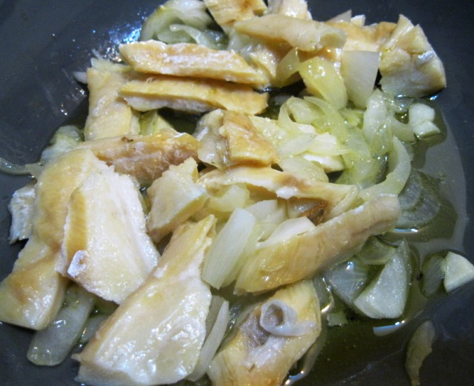 Num tacho de barro, deitei um fio de azeite, 2 dentes de alho esmagados, 1 cebola em pedacinhos, as lascas de bacalhau e deixei-os rebolar só um pouquinho.