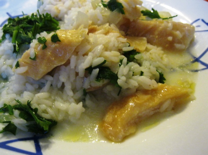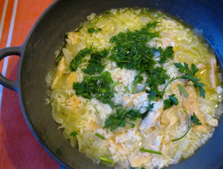 Juntei-lhes a água de escaldar o bacalhau, ainda quente, e depois arroz carolino.