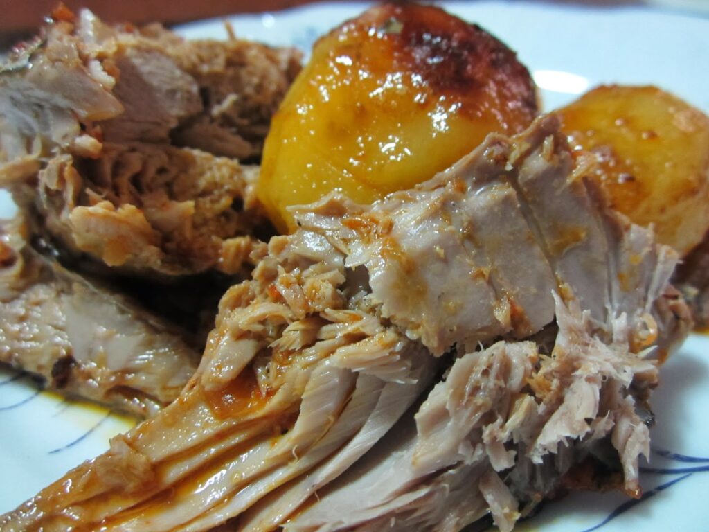 Rega-se com azeite e vinho branco e tempera-se com sal e pimenta. Vai a forno médio durante meia hora até a cebola ficar macia. Juntam-se então batatas pequenas descascadas e escalfadas durante um quarto de hora e volta a levar-se ao forno durante mais meia hora, até as batatas começarem a dourar.