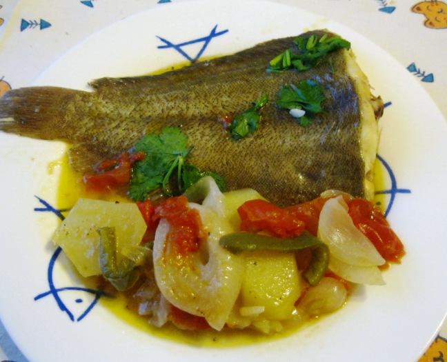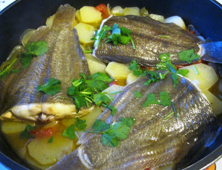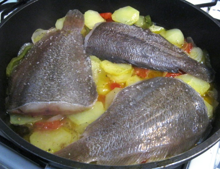 Coloquei 3 meios linguados sobre a mistura, tapei de novo o tacho e estufaram mais uns minutos.