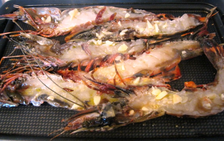 Abri-os ao meio, pelo dorso, até à cabeça, mantendo a casca (usei uma tesoura e uma faca de lâmina larga) e temperei-os com sal e um molho feito com azeite, 3 malaguetas secas, o sumo de meia lima e 3 dentes de alho picados.