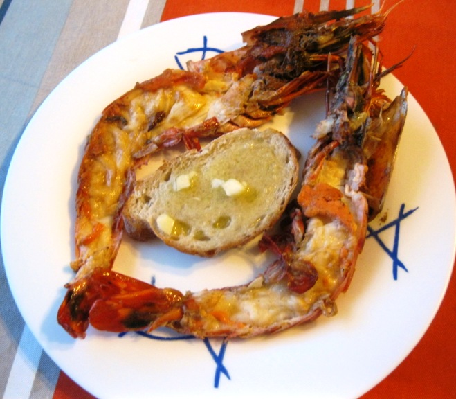 Entretanto, torrei ligeiramente fatias de pão de Mafra, espalhei nelas manteiga de alho e servi com os meios camarões.