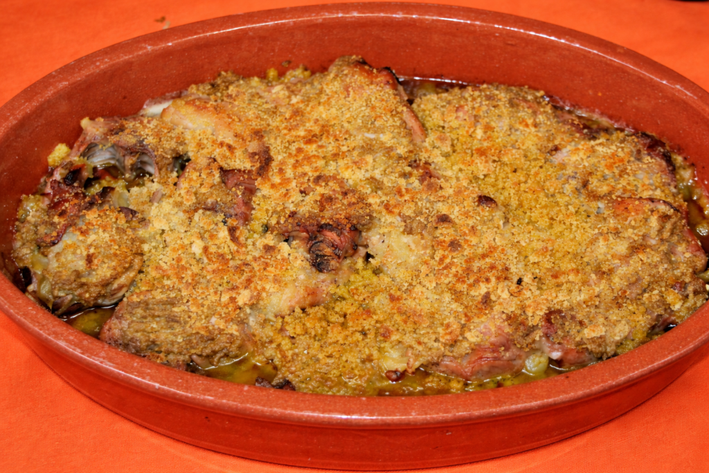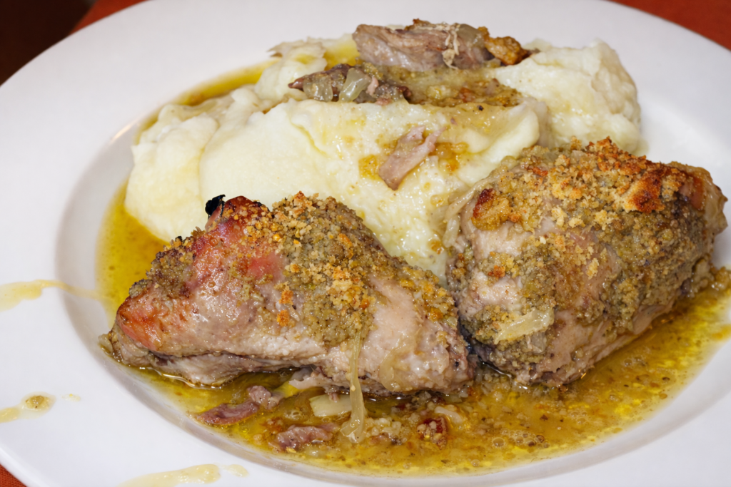 Coelho com broa e pasta de azeitona verde