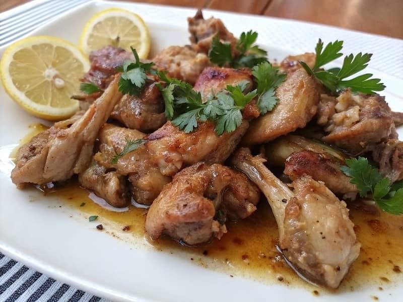 Baixa-se o lume, tapa-se e cozinha-se cerca de 25 a 30 minutos, até o coelho ficar macio e suculento.