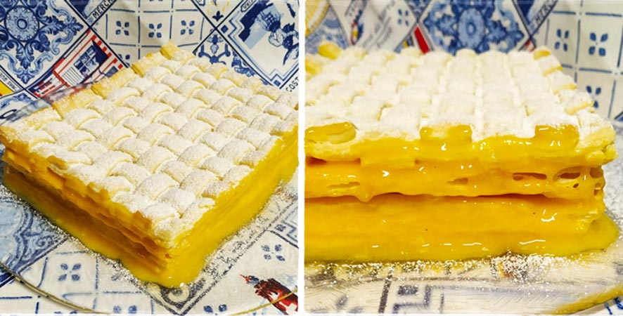 Dispor uma placa de massa folhada, barrá-la com doce de ovos e dispor outra placa por cima – repetindo o processo até empilhar as 4 placas “normais”.