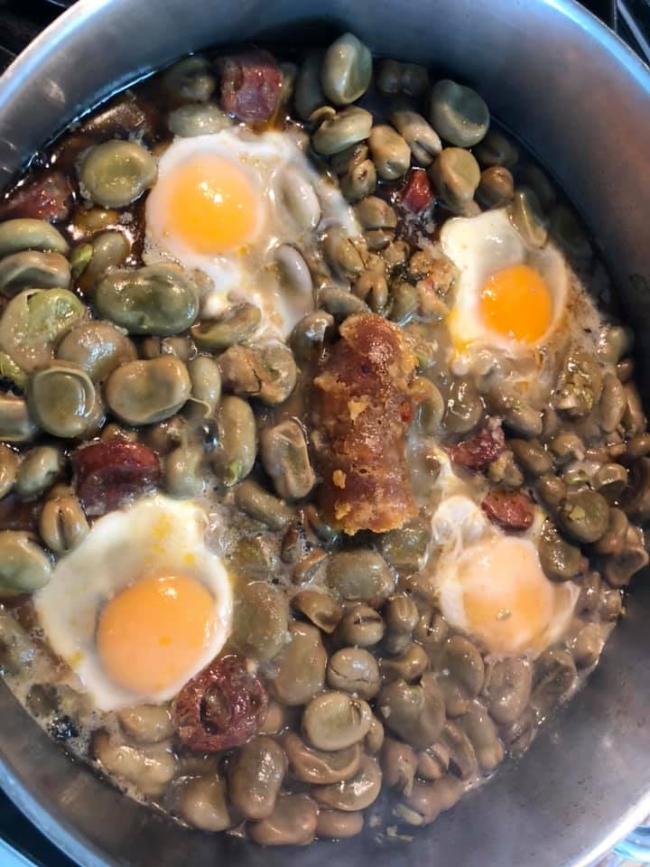 6️⃣ Ovos escalfados: Abra os ovos diretamente sobre as favas nos minutos finais da cozedura, tape o tacho e deixe escalfar até a clara cozinhar e a gema ficar cremosa.