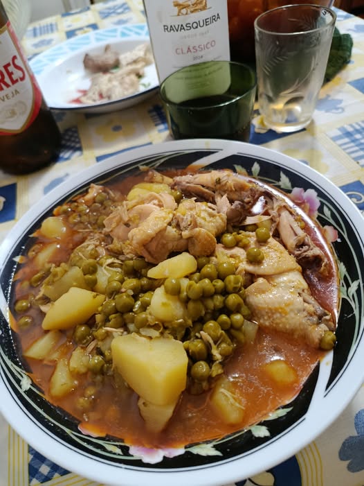 Molho avermelhado, batata macia a desfazer, ervilhas envolvidas no caldo e frango tenro que se solta do osso.