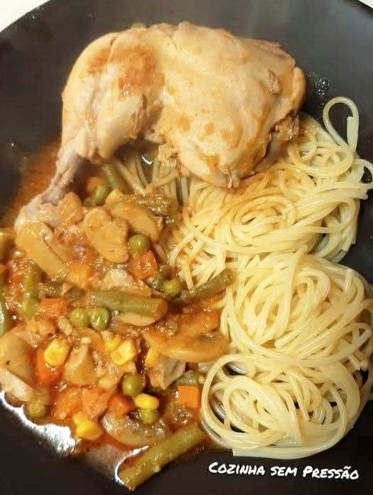Limpe o frango de peles, lave-o bem e coloque-o no tacho, tempere-o com sal, pimenta, cominhos,mexa bem e deixe-o alourar, adicione o tempero completo, o tempero para frango, a polpa de tomate e regue-o com o vinho branco, mexa e deixe-o estufar, assim que for necessário junte a água,acrescente os legumes e os cogumelos.