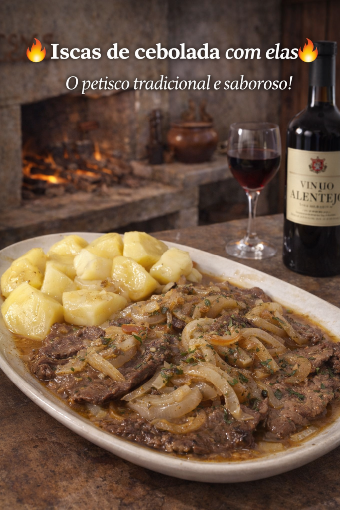 Cortar a cebola em rodelas e levar ao lume, num tacho juntamente com o azeite. Quando a cebola estiver amolecida, adicionar o louro e as iscas. Regar com o vinho branco, temperar com a pimenta e deixar cozinhar até as iscas ficarem tenrinhas (cerca de 20 minutos).