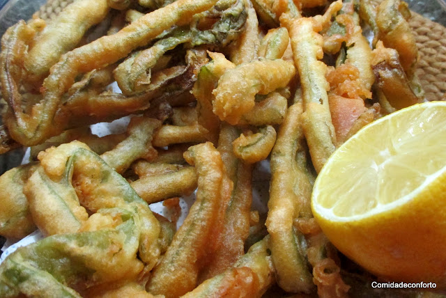 Pôr o feijão verde no polme, individualmente ou vários ao mesmo tempo, envolver bem e fritar numa frigideira alta com, pelo menos, dois dedos de altura de óleo bem quente.