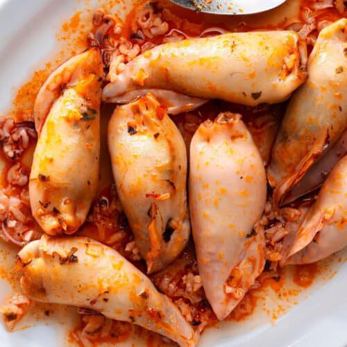 Limpamos as lulas, separamos os tentáculos e temperamos tudo com sal e pimenta.