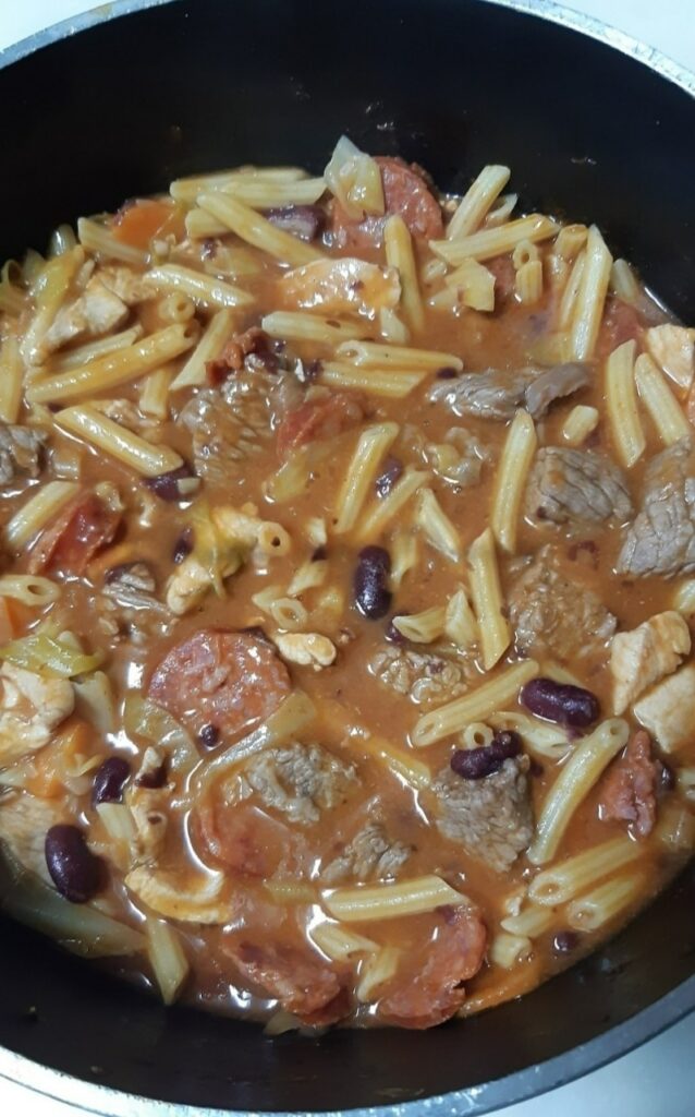 Acrescente a água aos poucos, junte o feijão, a massa ao seu gosto e deixe cozinhar. Assim que estiver pronto prove, e se for n e se for necessário retifique os temperos.
