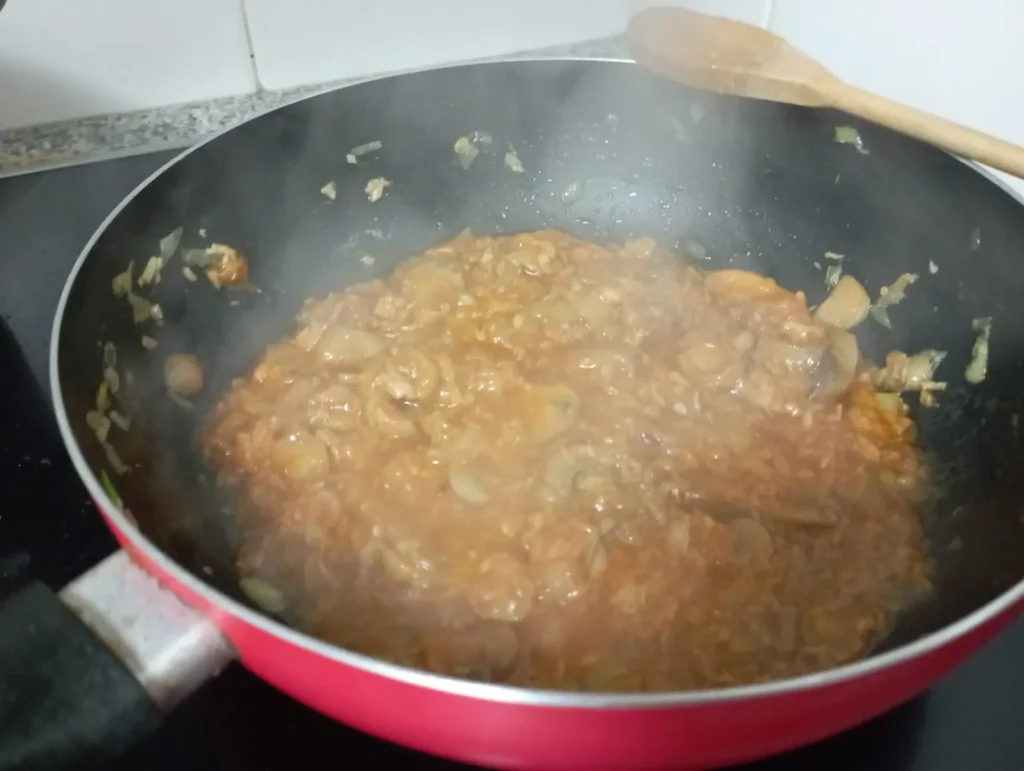 Deixe cozinhar cerca de 2 minutos e misture duas colheres de sopa de ketchup. Deixe cozinhar em lume brando mais uns minutos.