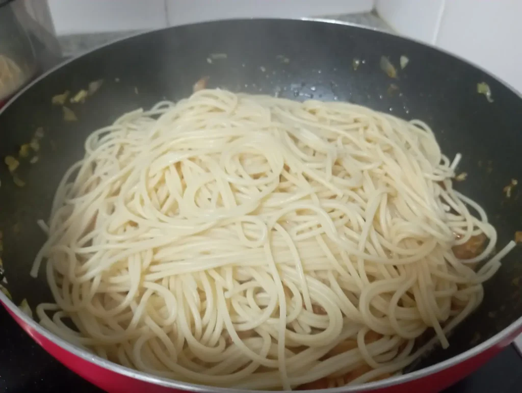 Quando a massa estiver cozida, escorra e misture-a com o preparado na frigideira.