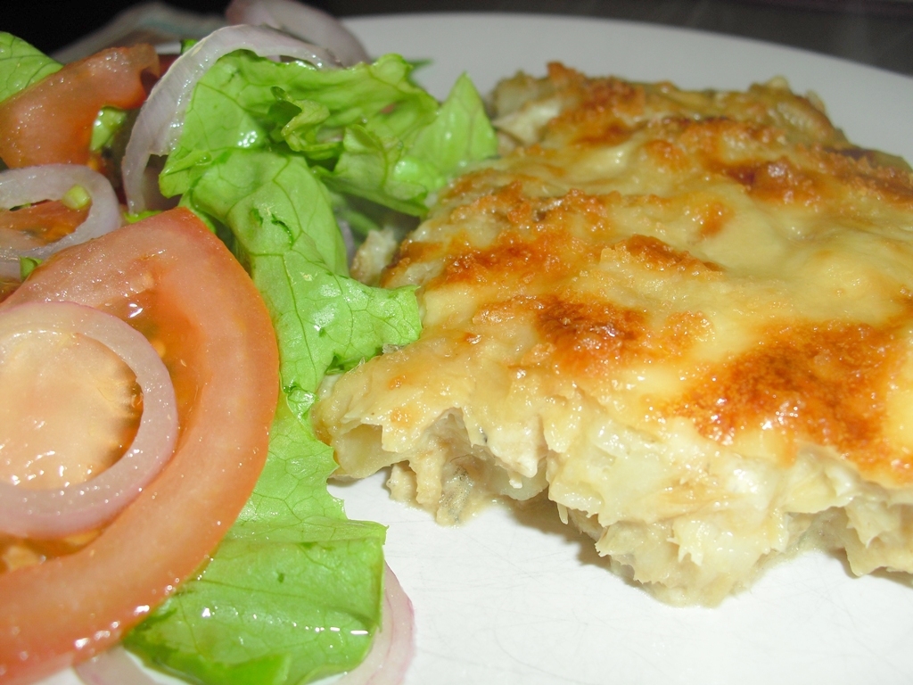Juntar as lascas do bacalhau e o pacote de natas, temperar com sal se achar necessário. Deixar levantar fervura e desligar (sempre que acho que pode estar um pouquinho seco acrescento um bocadinho do leite reservado).