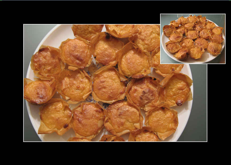 6. Forrar forminhas com a massa (duas ou três folhas) tendo em conta que as folhas terão de ser barradas com a manteiga derretida