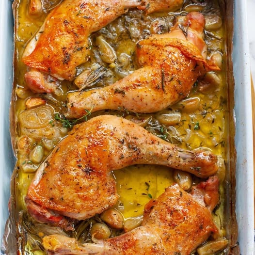 Colocar o frango sobre as chalotas e o alho, com o lado da pele para cima.