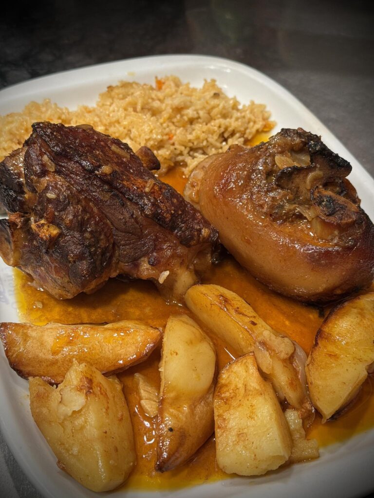“Pernil de porco no forno: molho no ponto, batatinhas a brilhar e carne a cair do osso 🐖🔥