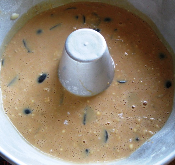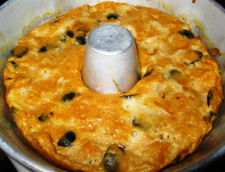 Em seguida, juntei uma boa mão cheia de azeitonas pretas descaroçadas, 2 postas de bacalhau demolhadas e depois desfiadas e 3 colheres de sopa rasas de farinha.