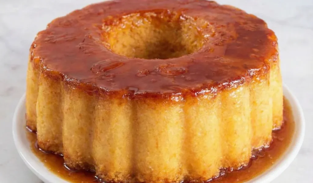 Verta a mistura para uma forma de pudim barrada com caramelo e tape.