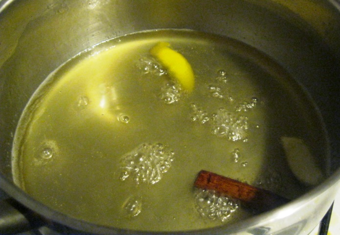 Num tacho, deitei 2 dl de água, 300 g de açúcar, 1 pau de canela, 2 tiras de casca de limão, 1 colher de sopa de manteiga, outra de mel e uma pitada de sal.
