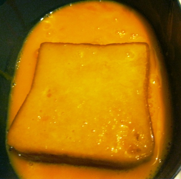 Embebi as fatias de pão na calda de açúcar e depois nas gemas batidas.