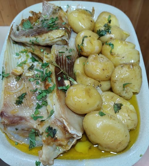4️⃣ Montagem: Coloque a raia e as batatas numa travessa, regue com o molho alhado e polvilhe com salsa fresca picada.