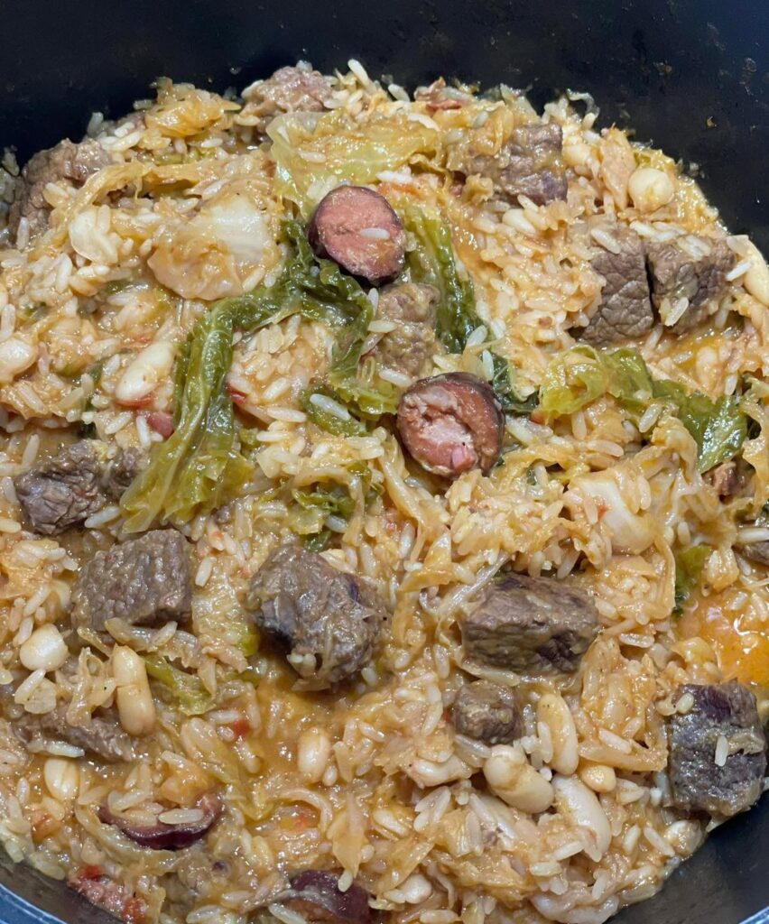 Quando a carne está quase cozida, juntar o repolho cortado em pedaços e lavado, Acrescentar a água equivalente ao arroz (4 copos de 25 cl, é importante a água estar a ferver) e deixar cozer o repolho durante uns 15 minutos (gosto dele bem cozido),