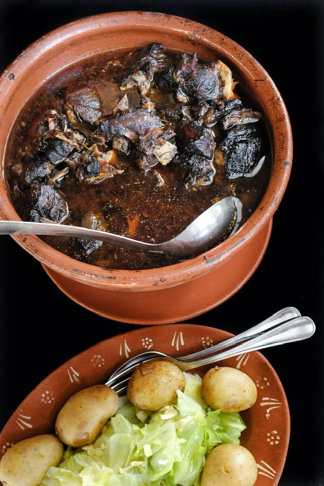 �O prato assim confecionado é servido com batata “fardada” (com pele) e grelos cozidos.
