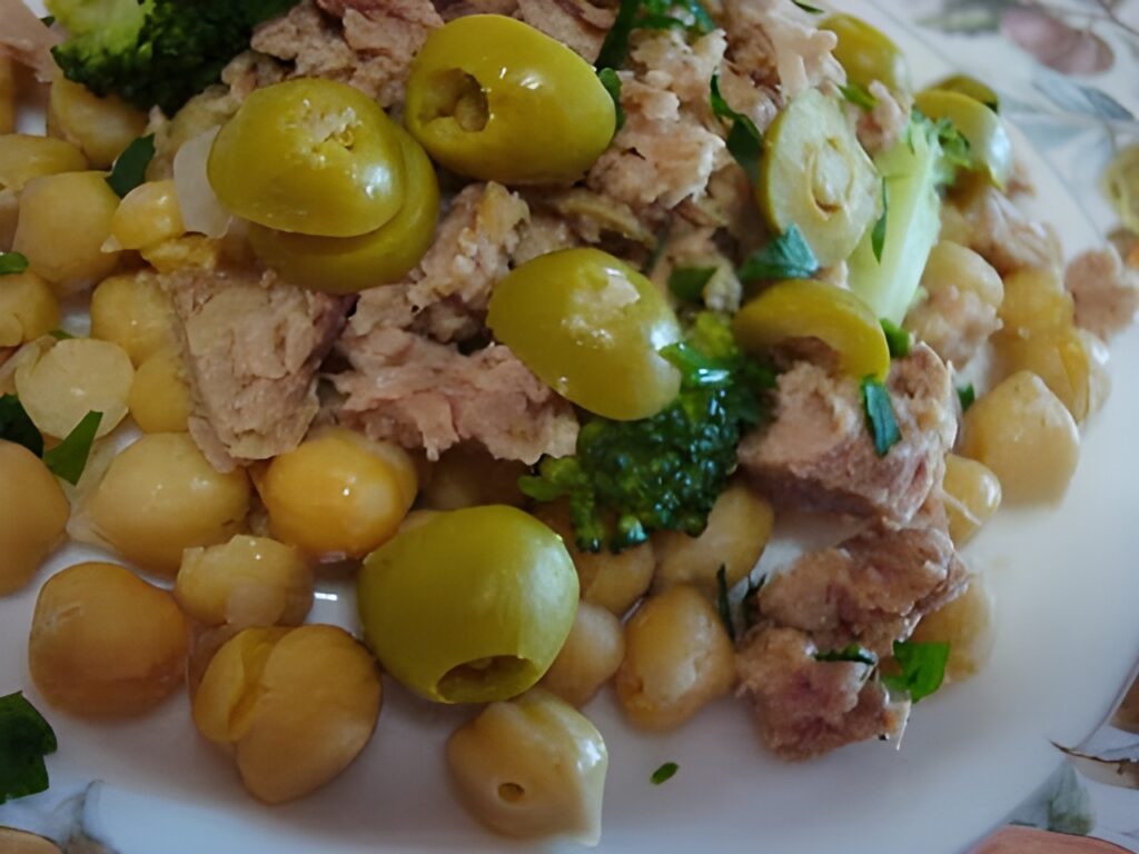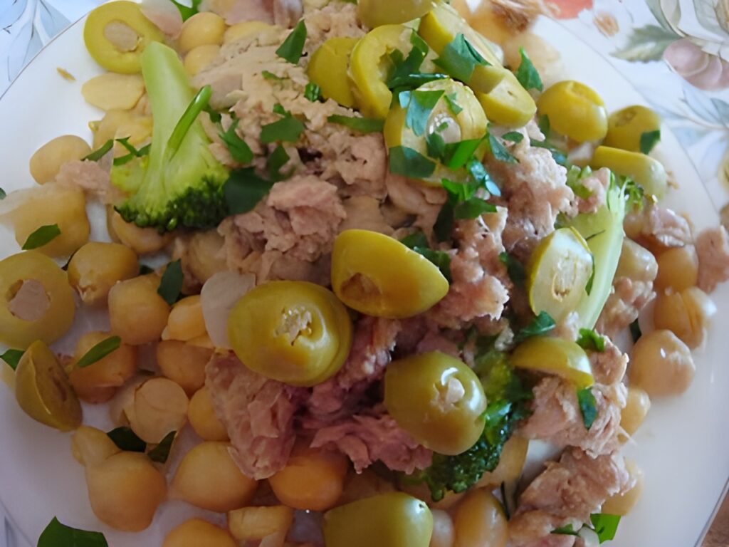 Numa saladeira, coloquei o grão cozido escorrido, o atum ligeiramente desfeito com as mãos, os ramalhetes de brócolos e polvilhei com salsa picada.