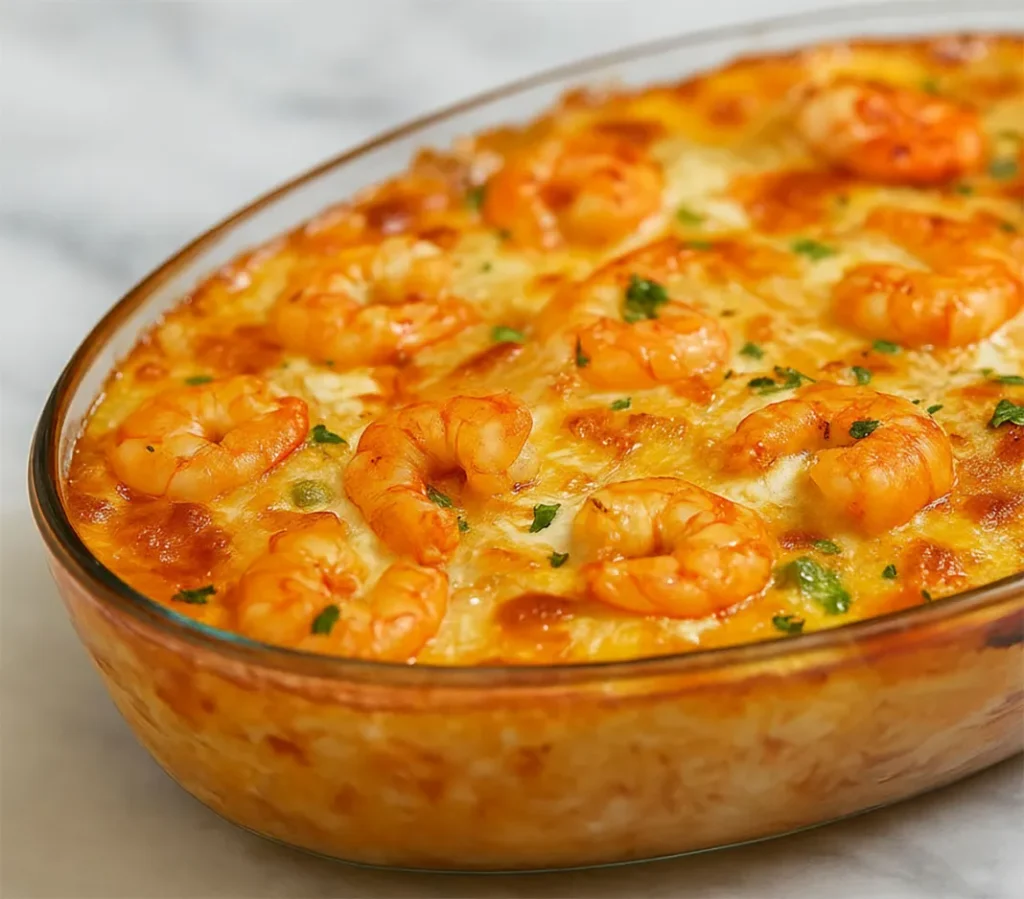 Camarões suculentos, molho cremoso, queijo dourado por cima…