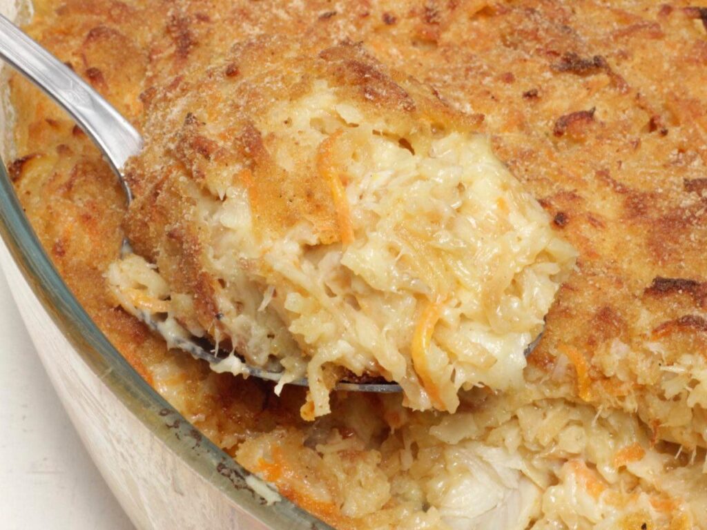 Verta para um pirex (onde vai servir) untado com manteiga e por cima deite o outro pacote de natas,mexendo com um garfo para que as natas se “infiltrem” no preparado e espalhe por cima bastante queijo ralado.